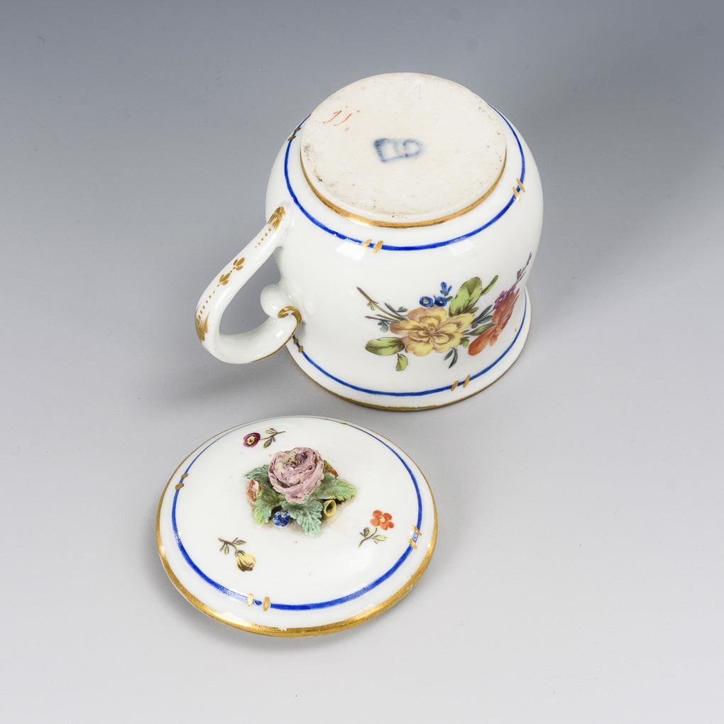 Light baluster form with ear handle and flower knob lid. On both sides a floral bouquet. Flower restored and bumped, gold partly rubbed.