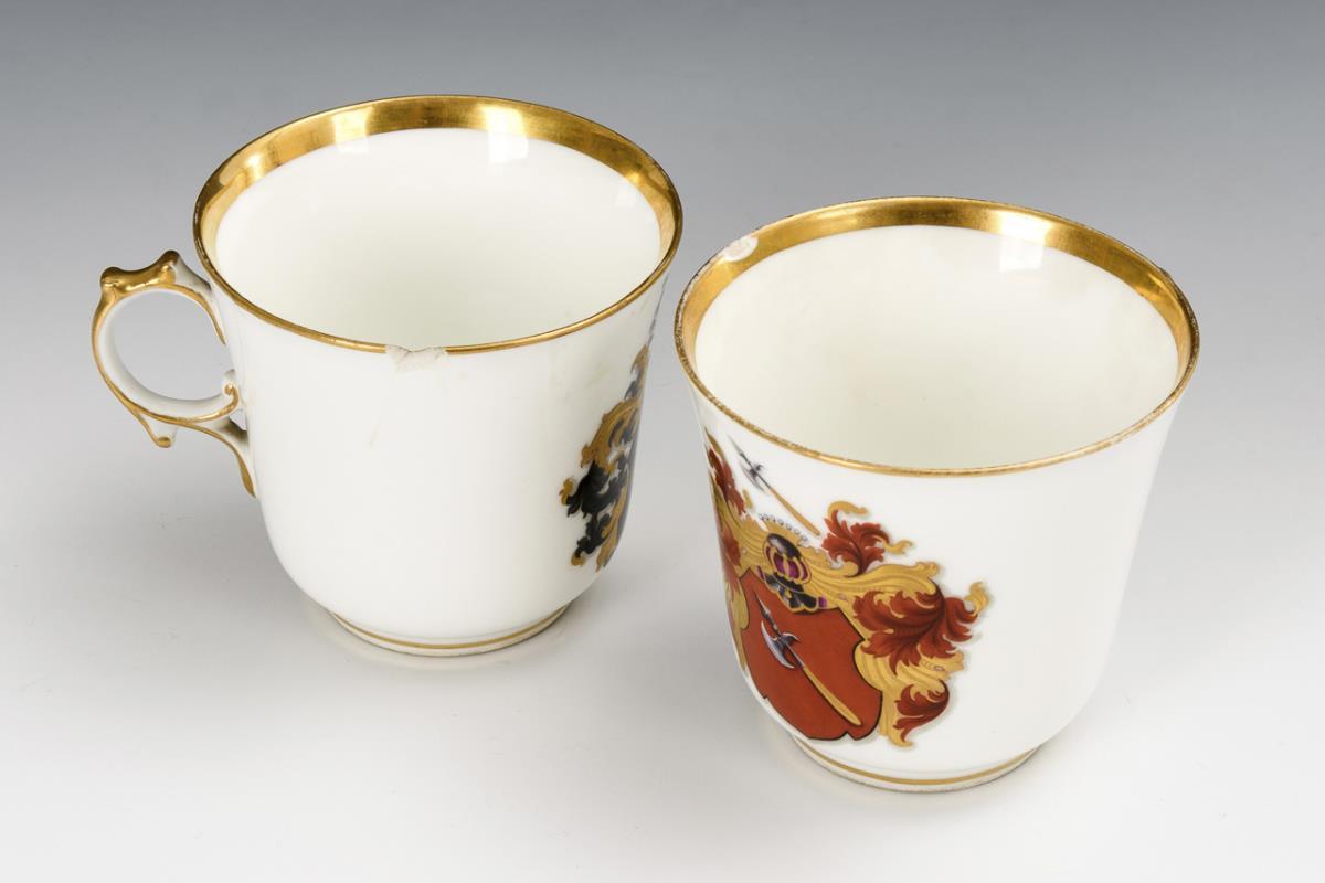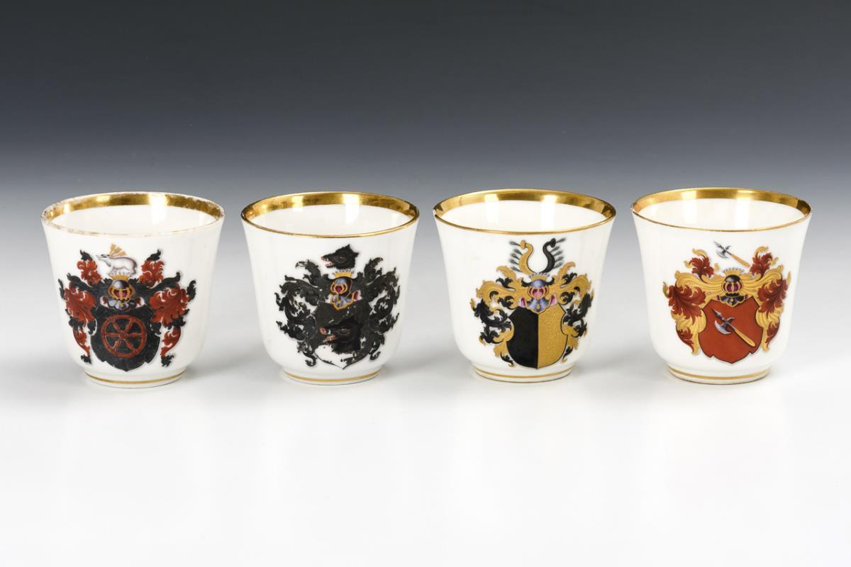 4 conical cups with rocaille flared handles. On the front of each a coat of arms depiction (including family von Jagow, family von Hardenberg). 1x with hairline crack and edge bump, 1x with edge chip, partial gold abrasion.