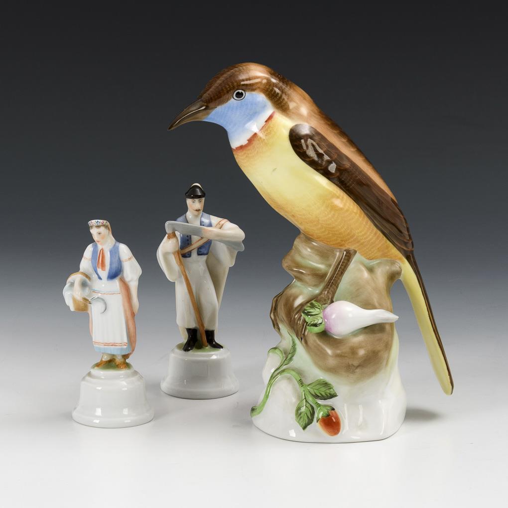1x 1x bird sitting on a tree stump with fruit (h 17 cm). / 2 peasant figures: Hungarian peasant with scythe and Hungarian peasant woman with basket and sickle (h each 10 cm). peasant woman glued.