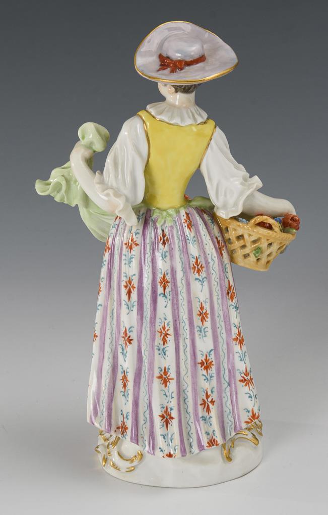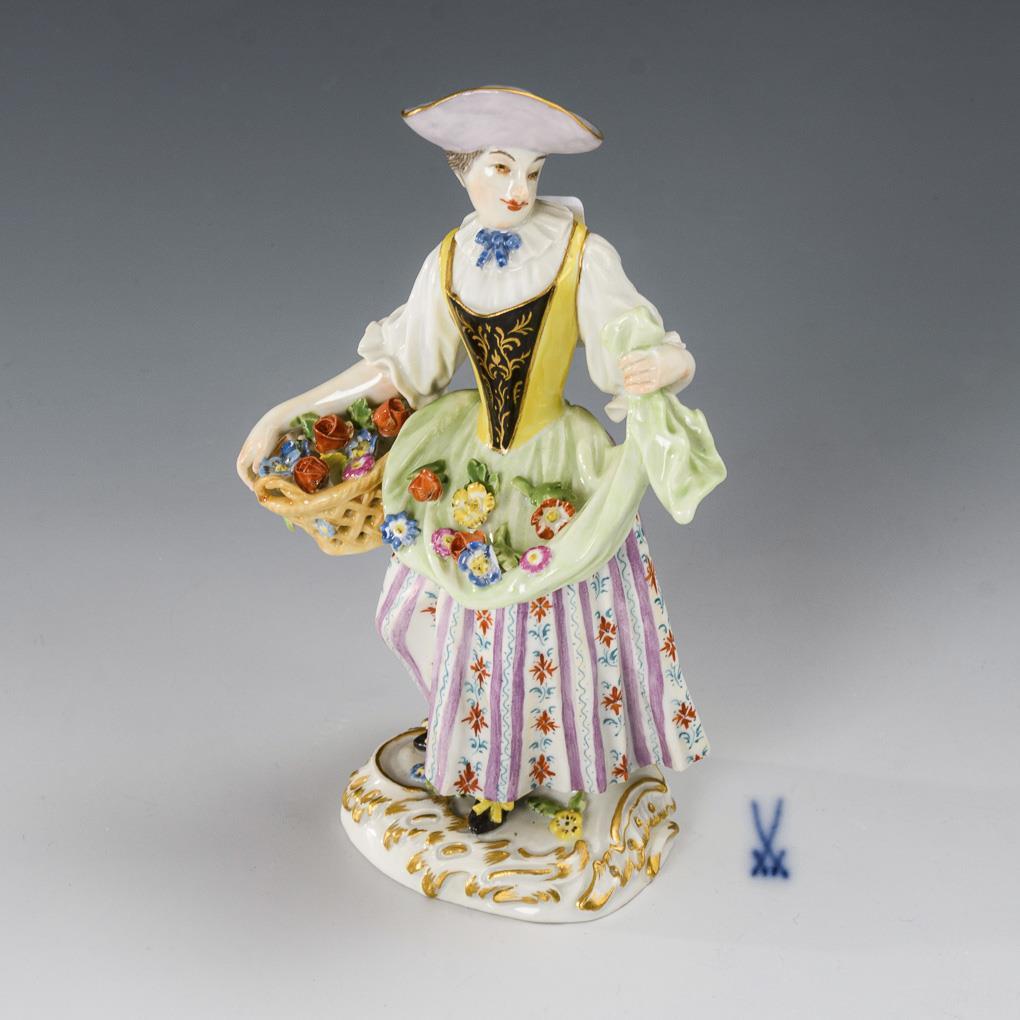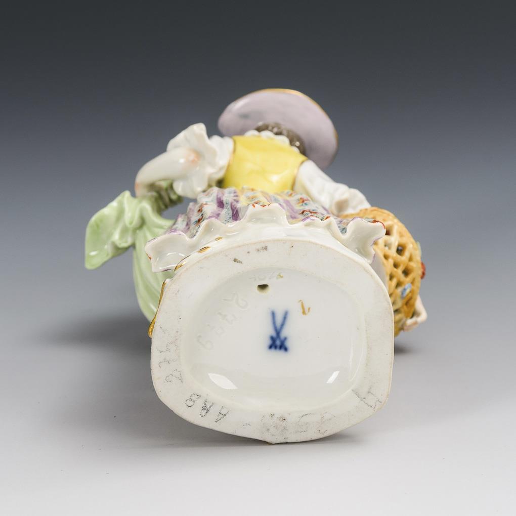 On a rocaille base standing gardener with flower basket. 1 finger and 1 flower bumped.