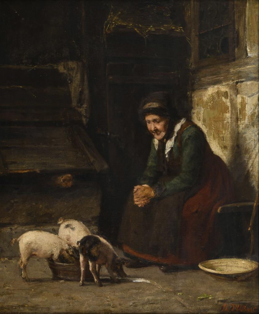 Old farmer's wife looking at the feeding piglets in front of the entrance to the barn. Traces of age.