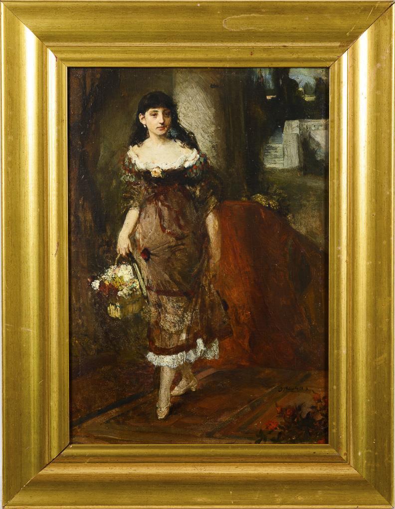 Young woman in dress and with flower basket in southern interior. Slight signs of age.