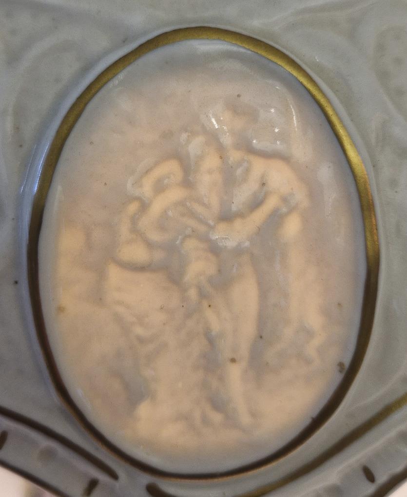Two couples of children dancing a round dance around a tree trunk as a stem, rocaillereliefed and flower-covered lampshade with four lithophane images. Electrified (function not tested).