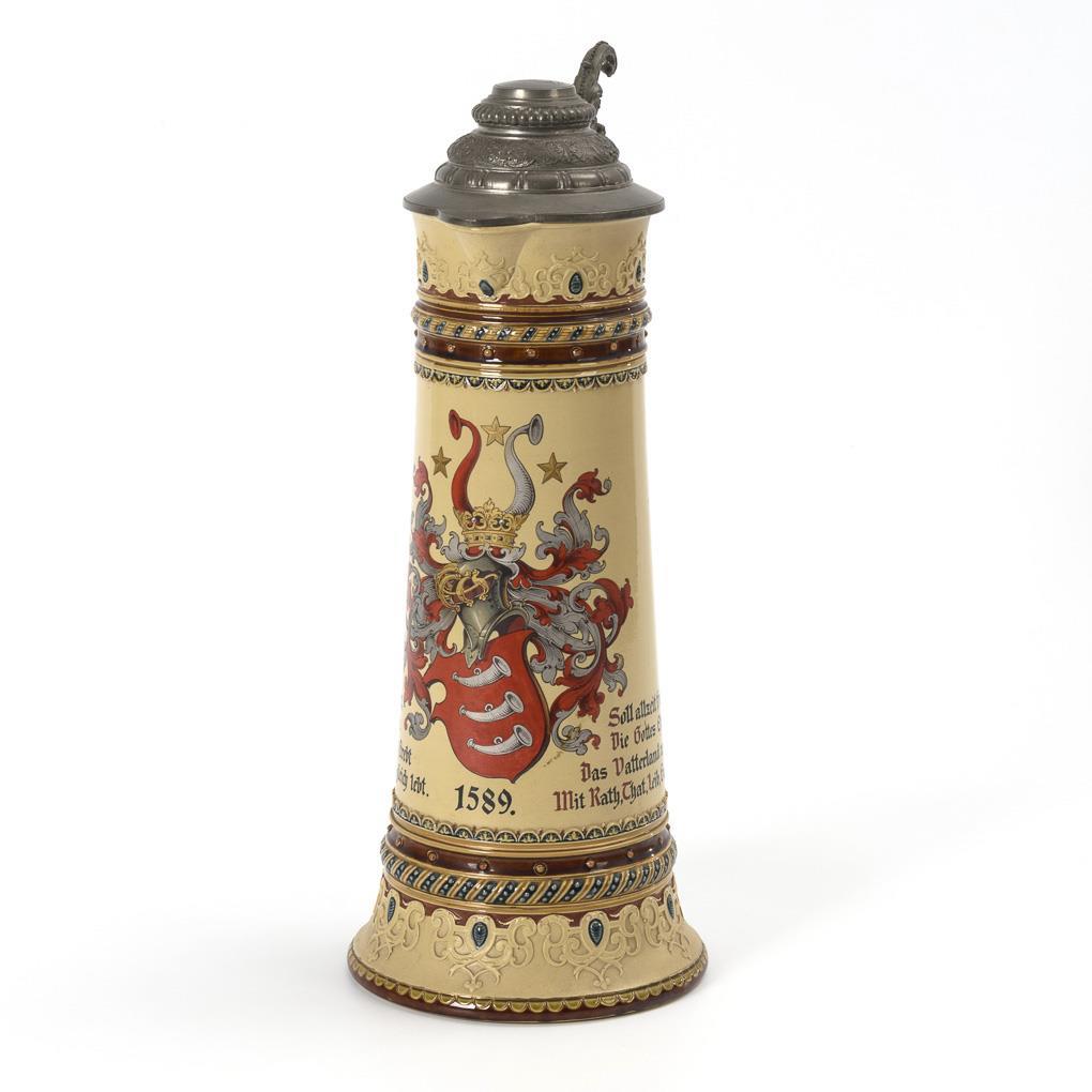 Quick with painted coat of arms (3 horns) and motto and year "1589". Reliefed pewter lid with dolphin pusher and engraved horn. In addition, letter of 1947 with dedication to the jug.