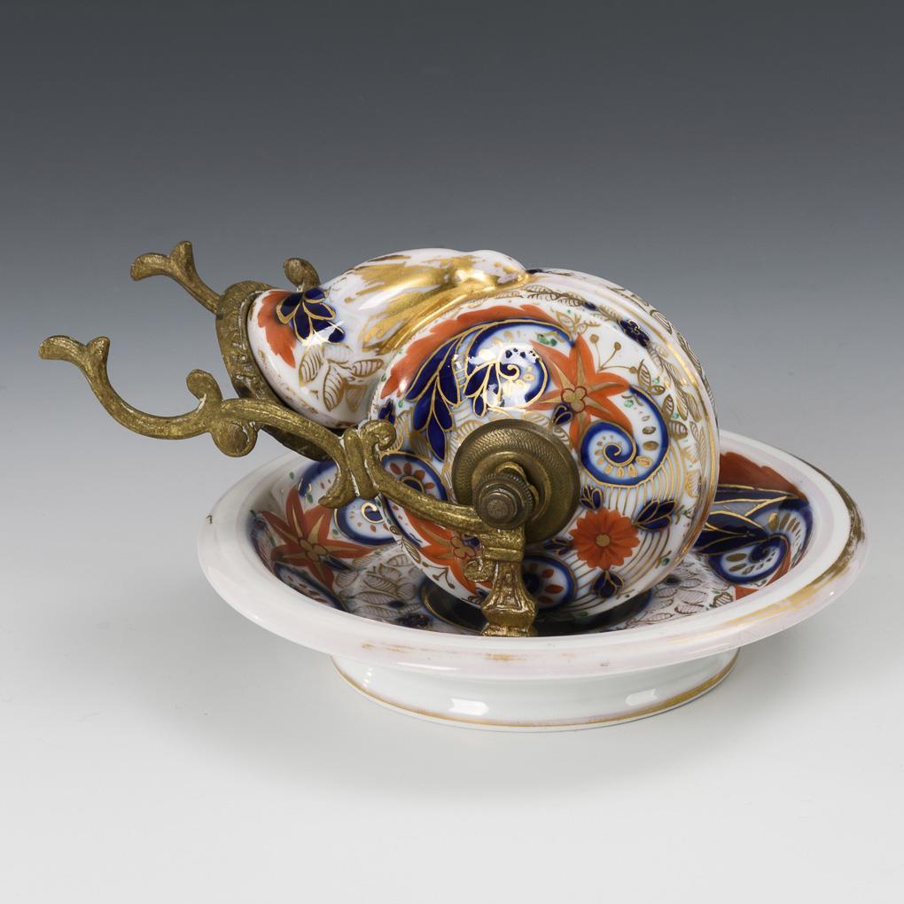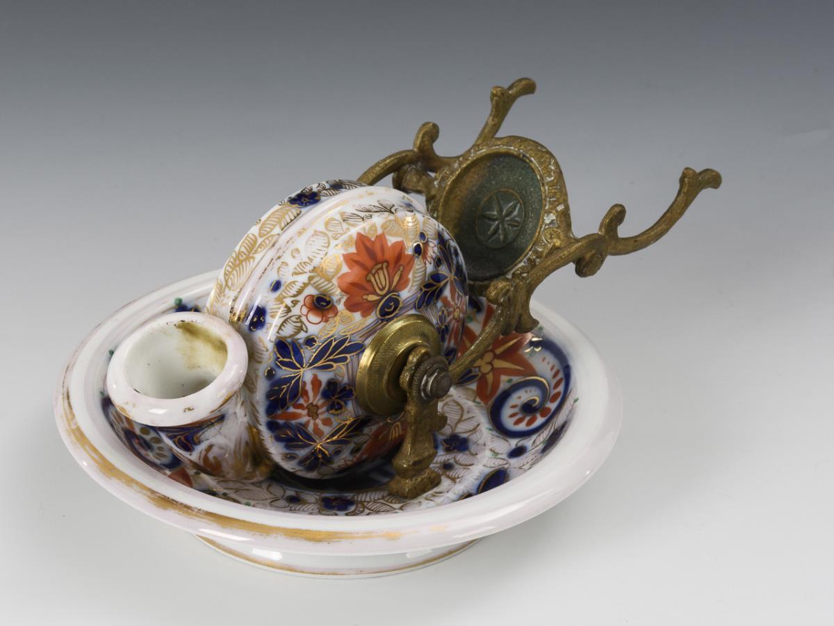 In the manner of Imari colorfully painted porcelain bowl and snail-like inkwell, which is rotatably mounted in the brass holder, which also serves as a pen tray. Gold rubbed.