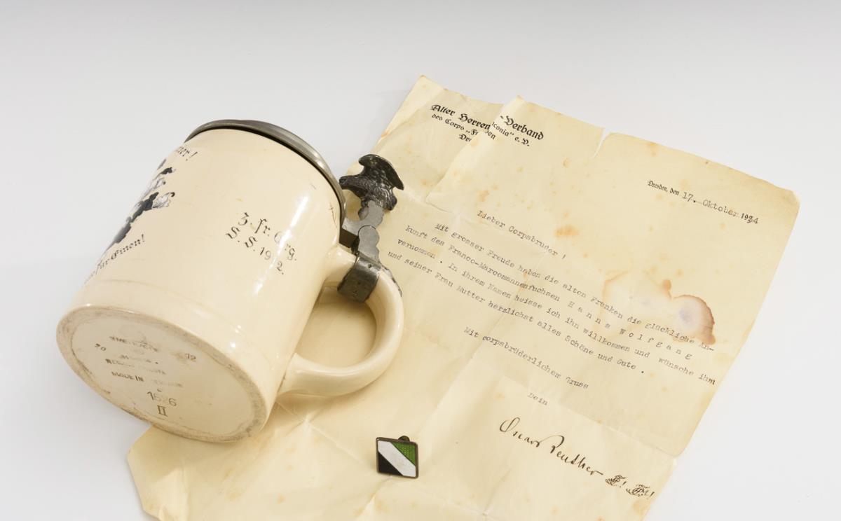 Painted connection coat of arms with panier, dedication and date 1912. Pewter lid with coat of arms relief and engraved compass and eagle pusher. Enclosed 1 square cufflink in the connection colors (enamel), 1 letter from 1934 and 1 postcard. Enclosures with strong signs of age / use.