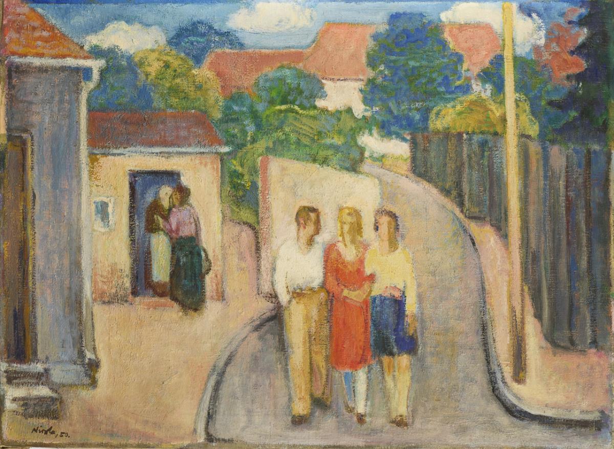 Strollers in the sunshine on the street between houses. Illustrated in: SLUB, Deutsche Fotothek, record 89004504. A small restored spot with backing.