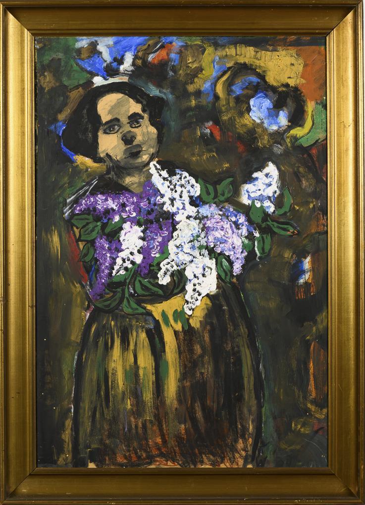 Expressive portrait of a woman with the bright lilac flowers in her hands against an abstract background. Traces of age.