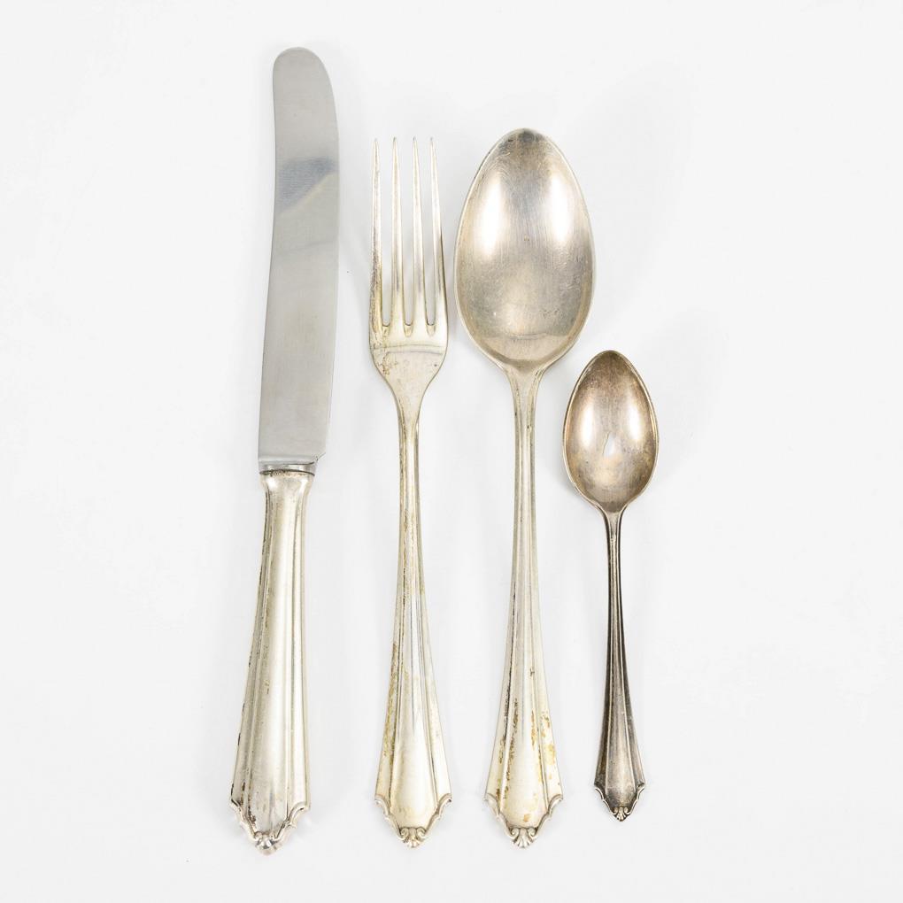 23 pieces with small rocaille ornament at the end of the handle: 6 knives, 6 forks, 6 spoons, 5 teaspoons. Signs of use.