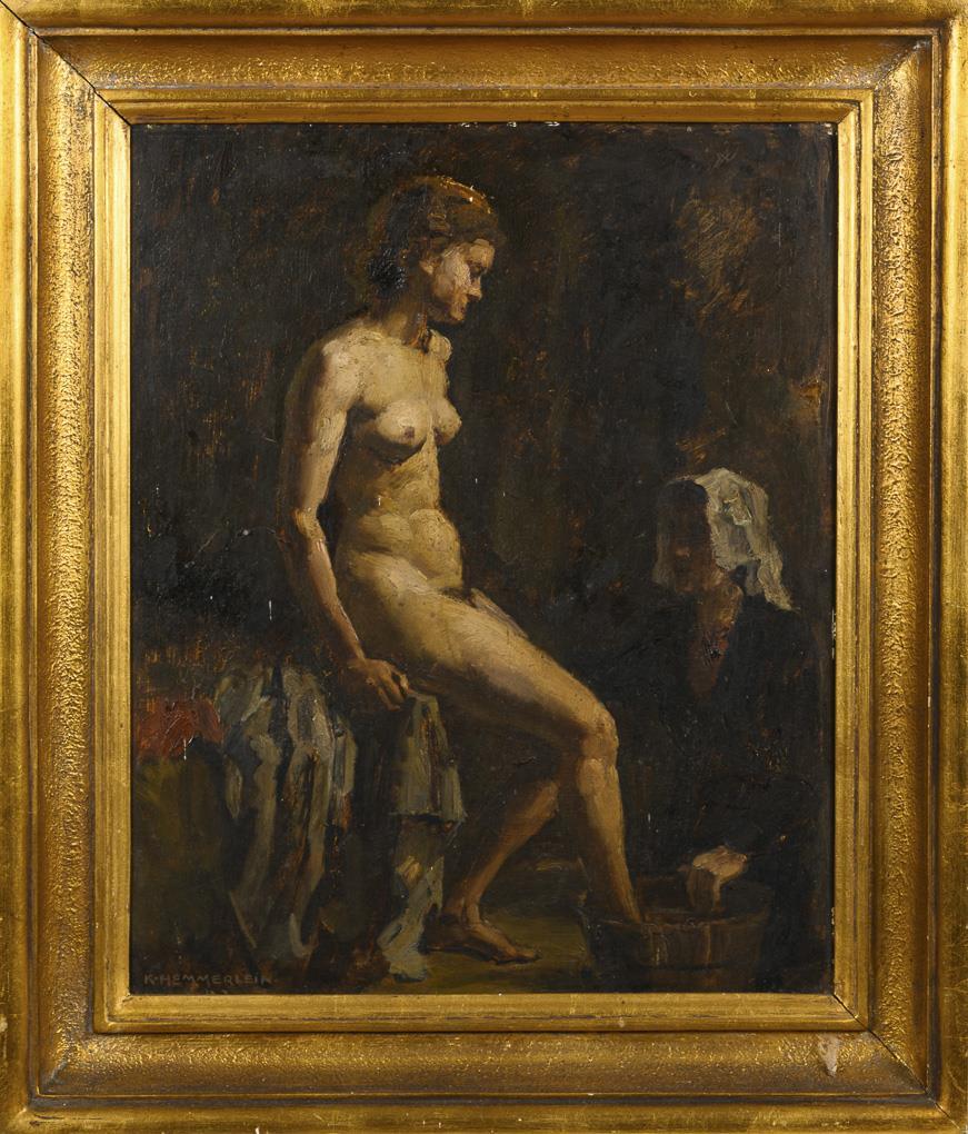 Nude young woman in bright light washing a foot in the bucket and a helping maid. Traces of age.