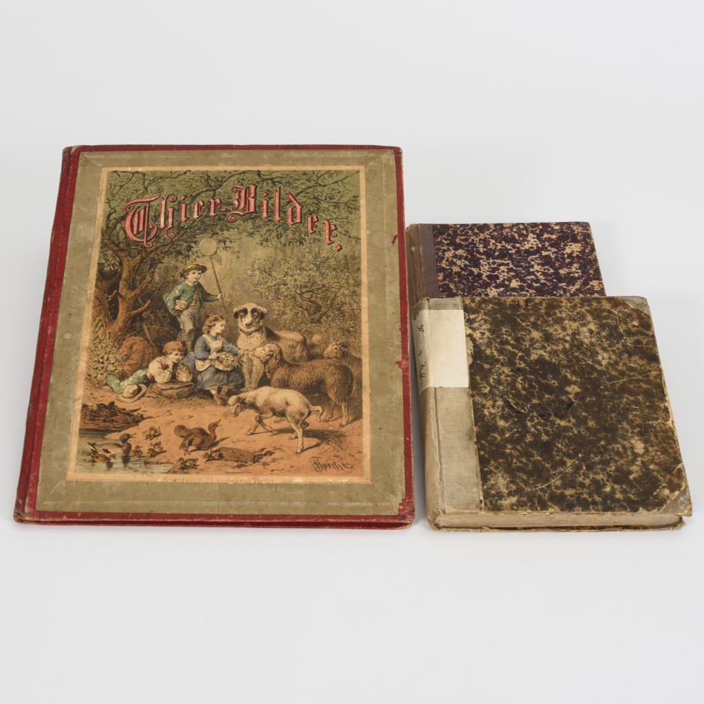 G. Mandel: "Thierbilder. Darstellungen aus dem Leben und für die Kinderwelt erzählt." 3. Auflage, Stuttgart, Thienemann's Verlag, (1868), 36 Seiten teils mit Farblithographien, nach C. Offterdinger und Robert Aßmus. 28 x 23 cm. / Stieff, Henriette "Die Nachbarskinder". Carl Flemming. Glogau, 1857, 234 Seiten, Innen mit handschriftlichen Notizen auf Vorsatz, durchgehend etwas braunfleckig, wenige Seiten jedoch stärker. Mit 8 farbigen Lithos von Rudolf Geissler. 18 x 15 cm. / Filhes und Ebeling: "Zugvögel". Berlin bei Winckelmann und Söhne. 204 Seiten mit 6 Farblithographien. 14,5 x 13 cm.