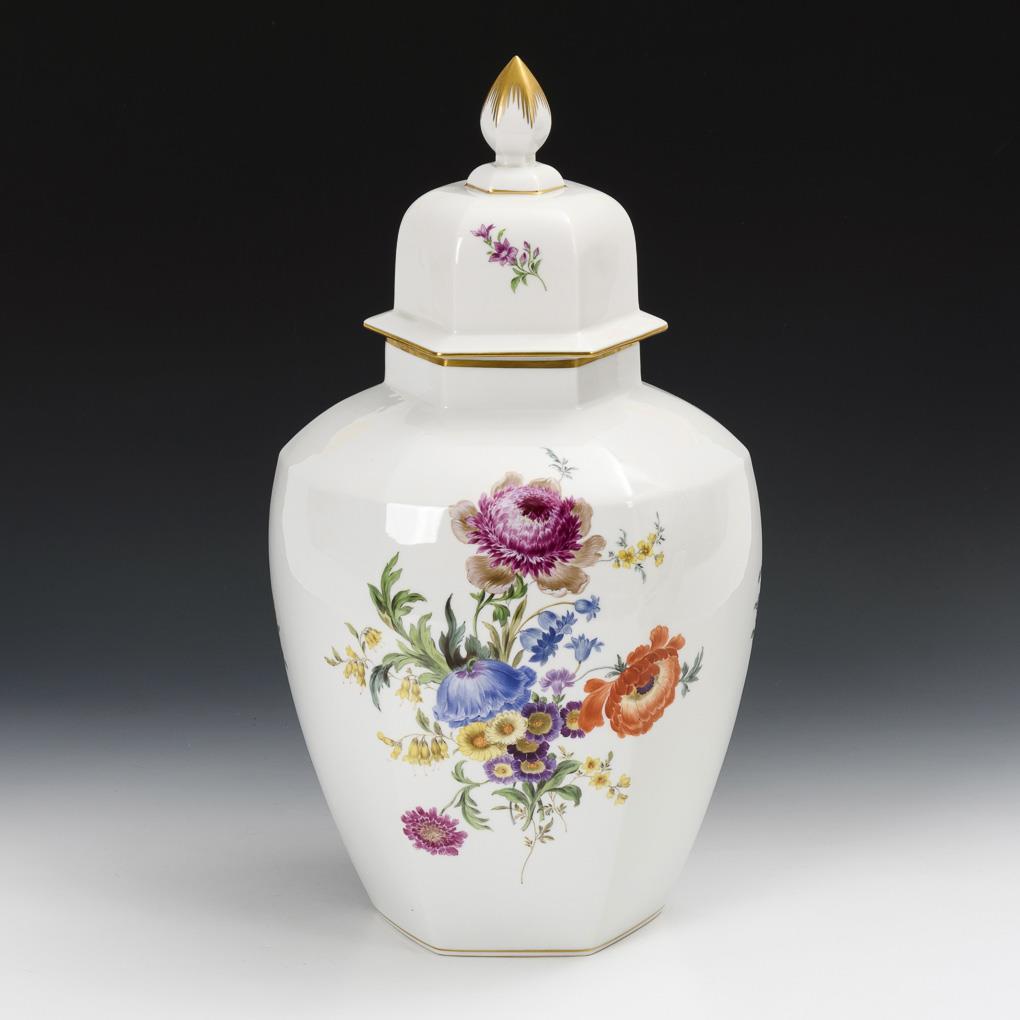 Hexagonal baluster vase with knob lid. On both sides a large bouquet of flowers.