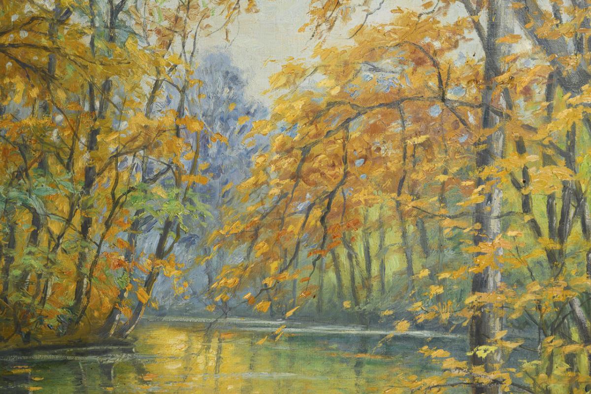 Large depiction of the park grounds with the leisurely flowing river under autumnally colored treetops on a sunny day.