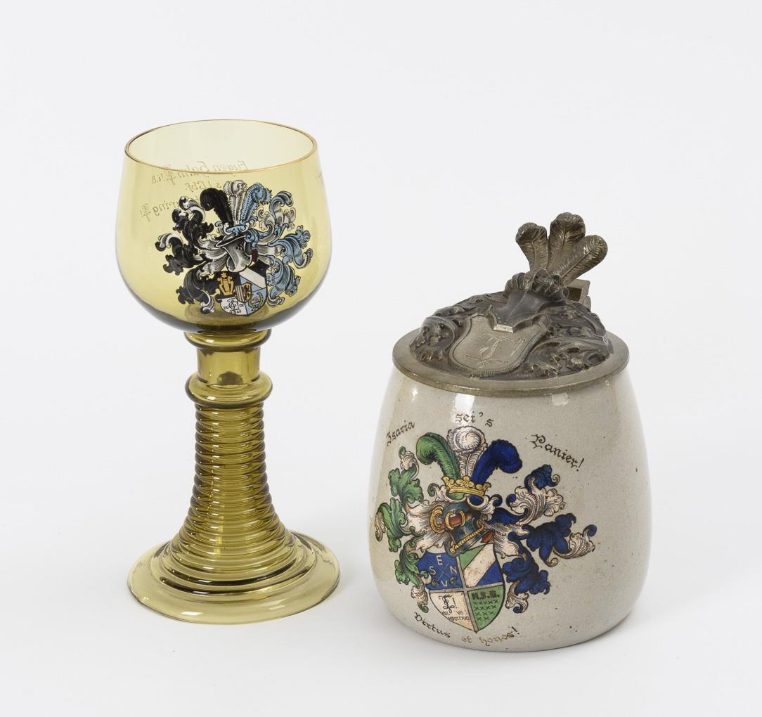 Half-liter stoneware jug with painted fraternity coat of arms and engraved compass on the coat of arms pewter lid and name list and date 1928 (Isaria Corps Munich, Ad. Müller Munich signed). / Quarter-liter romer of green glass with painted fraternity coat of arms and dedication. / 6 different color ribbons, 1x with coat of arms button and slider. / 6 caps. / 6 tails. / 3 commers books (1895 and 1924, 1x with dedication of 1858). Partly strong signs of age / use.