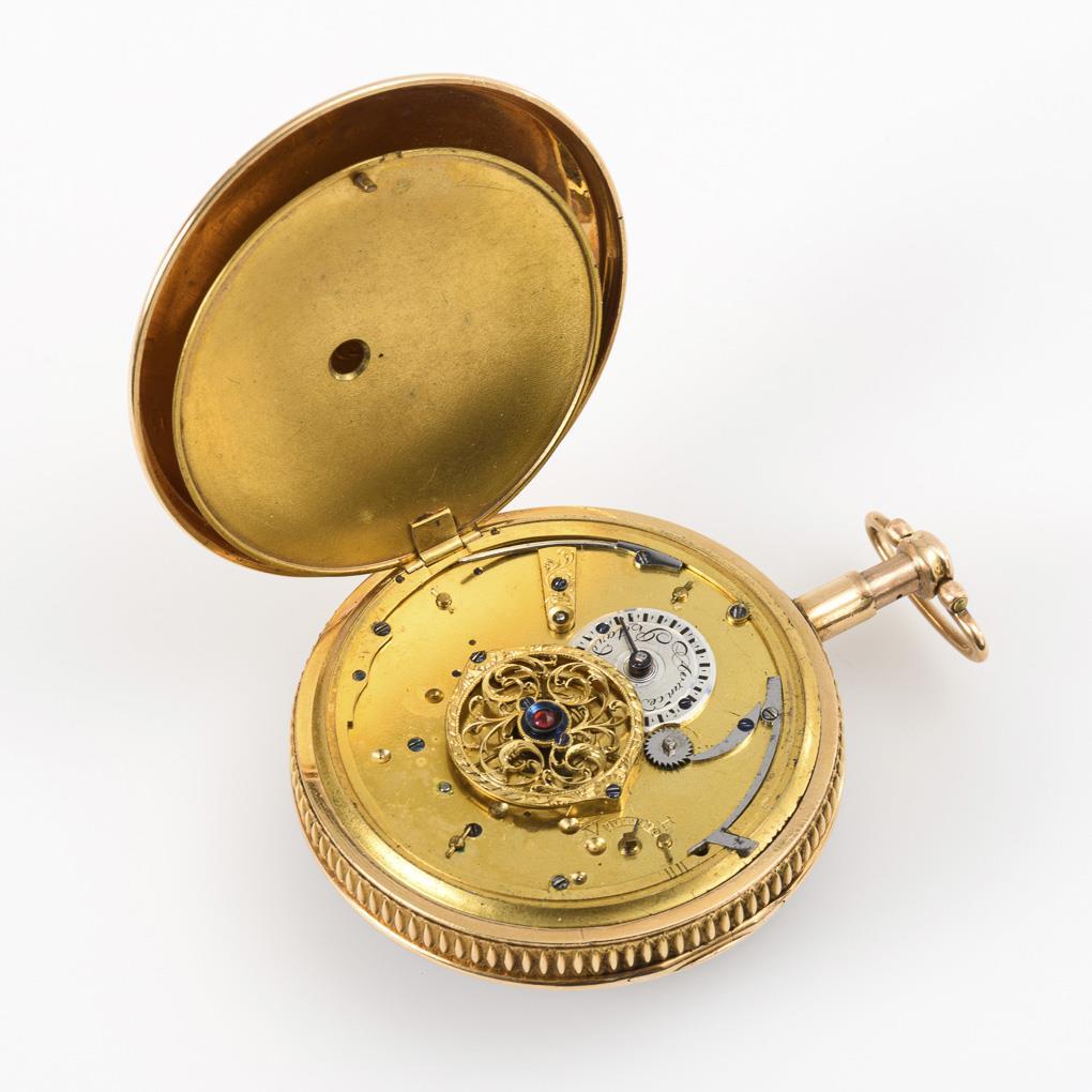 18 kt hallmarked, brass dust cover. Ø 5,5 cm. 130 g.