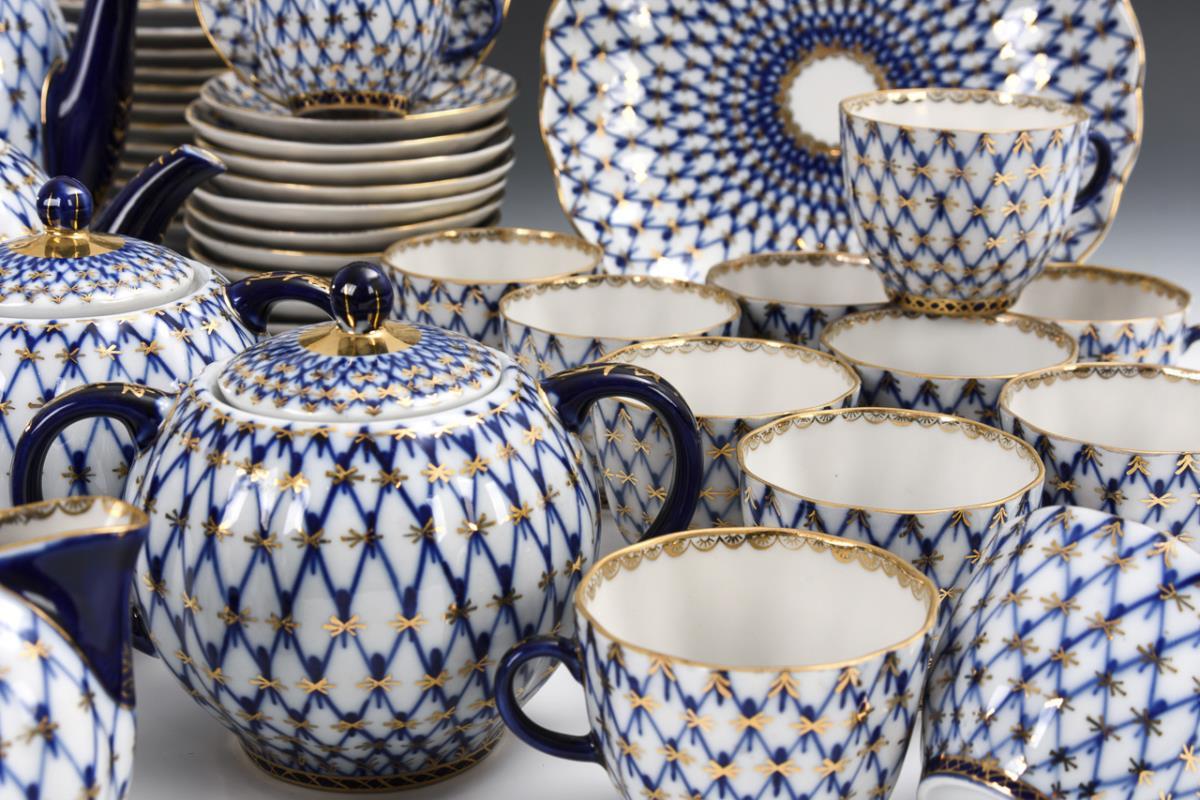 45 pieces. Cobalt blue net pattern and gold staffage. Coffee pot (H 19 cm), teapot (H 13 cm), 2 sugar bowls, 2 milk jugs, 12 coffee cups, 12 saucers, 13 cake plates and 2 bowls (Ø 22 cm). 1 cake plate with gold coloring.