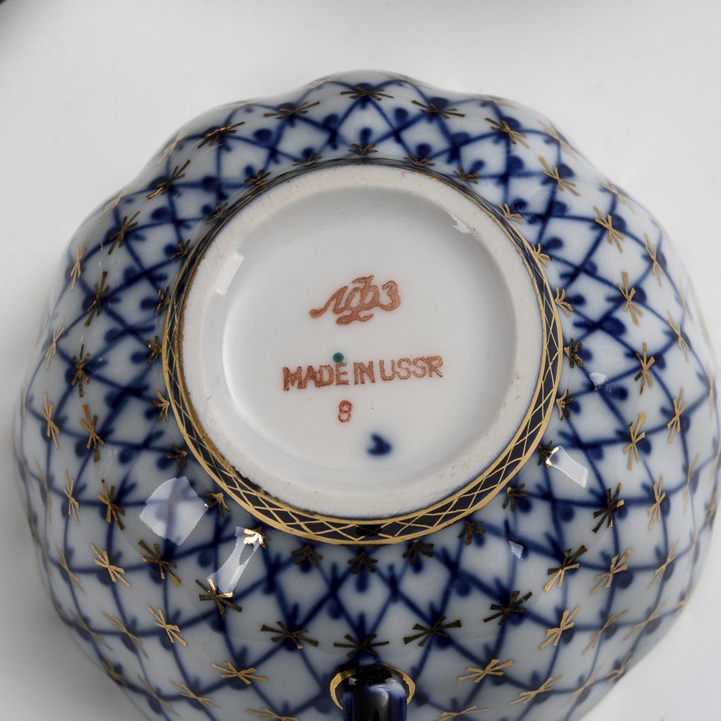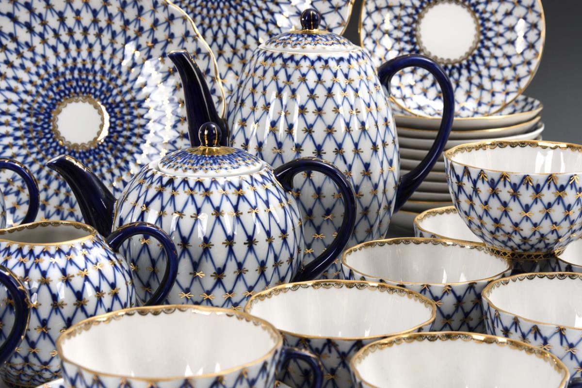 44 pieces. Cobalt blue net pattern and gold staffage. Coffee pot (h 19 cm), teapot (h 13 cm), 2 sugar bowls, 2 milk jugs, 12 cups, 12 saucers, 12 cake plates and 2 bowls (Ø 21,5 cm).