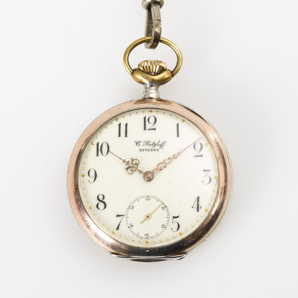 Guilloché galonné case with empty coat of arms reserve, engraved "Franz Philipp, Ostrowo" on the back cover. Comes with a metal chain with partly colored decorative links, lobster clasp and spring ring, L 28.5 cm. Slightly rubbed and partially dented.