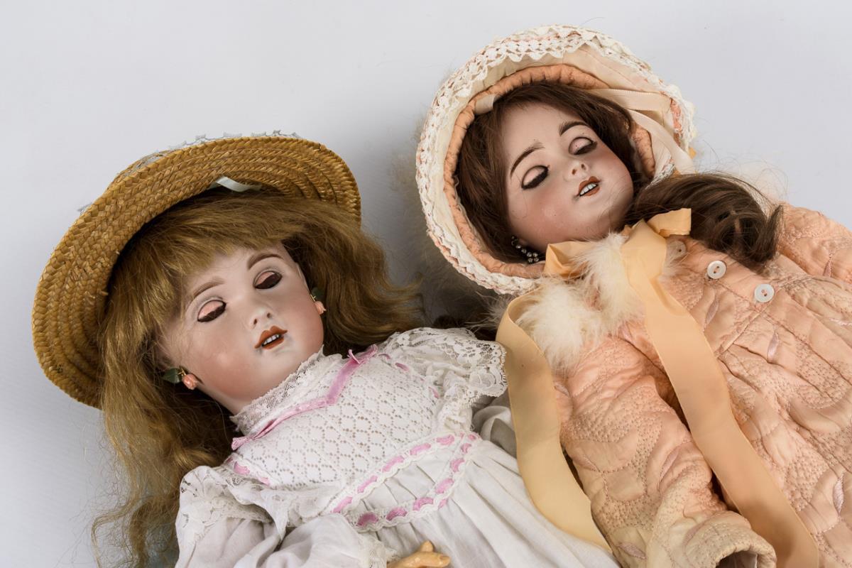 Both with crank head, blue sleeping eyes, eyelashes and 11-piece limb body. 1x blond with white dress, 1x brown-haired with salmon-colored coat and matching hood. 1x with restored head, 1x head without defects, only small chip on the right earlobe. Body with paint defects or overpaintings.