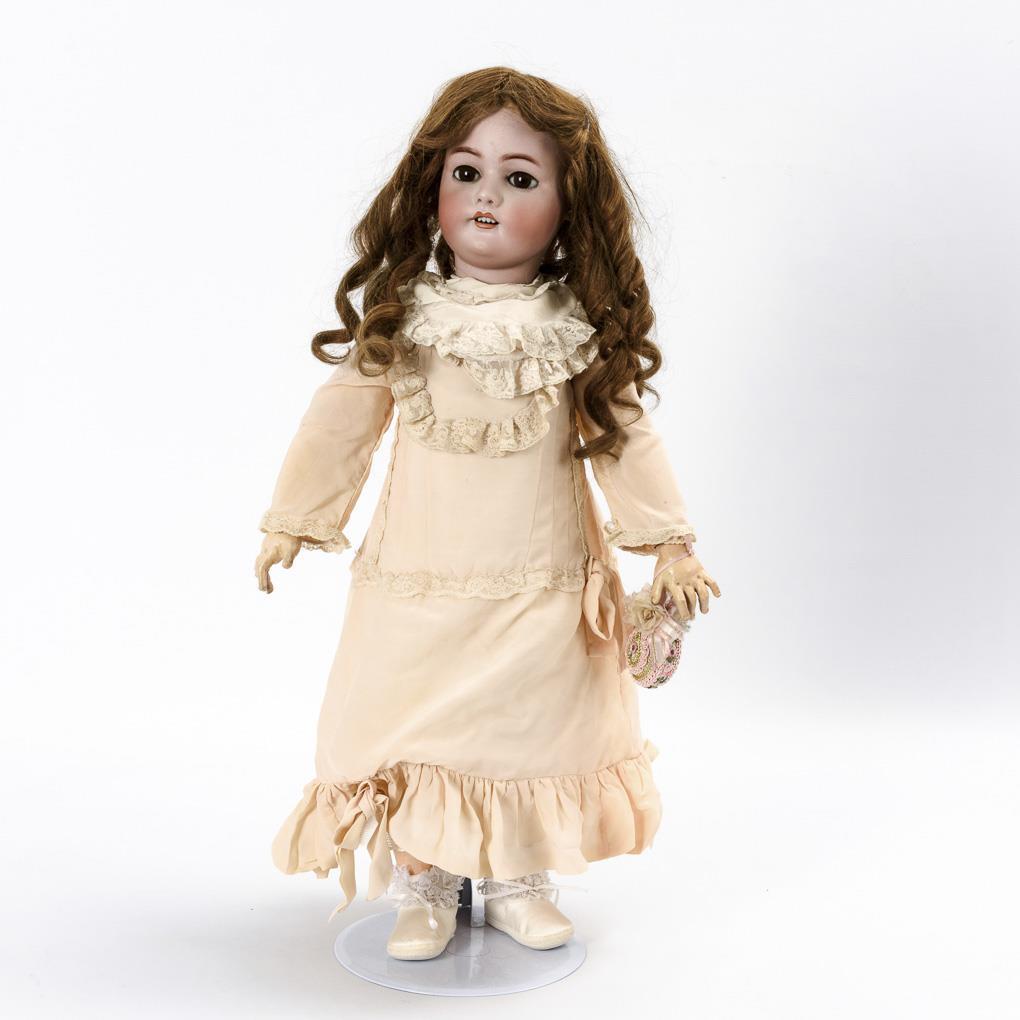 Crank head, brown sleeping eyes, eyelashes, earrings, reddish-brown human hair wig. 11-piece articulated body with 2-section torso and silenced train voice (without train straps). Light pink dress, younger supplemented white satin shoes. Head x-rayed: without defects, body probably partially somewhat painted over.