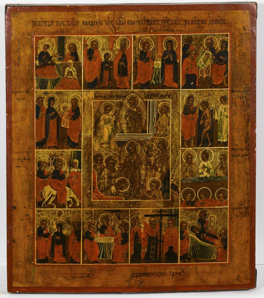 The twelve high feasts and the main feast of Easter with the resurrection of Christ. Slight signs of age.