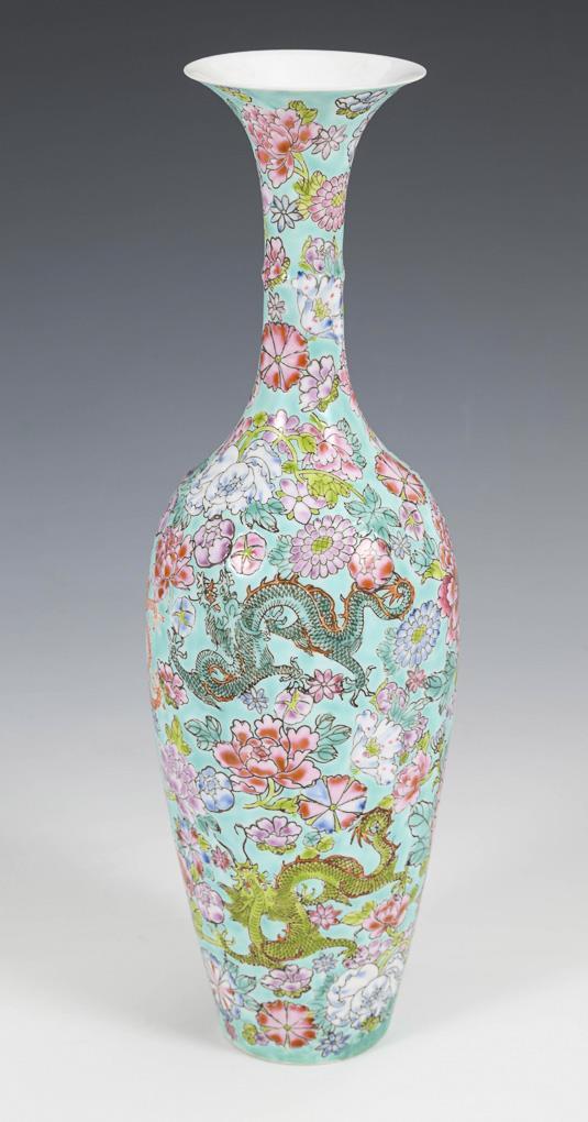 Green background with fine dragon and flower painting.
