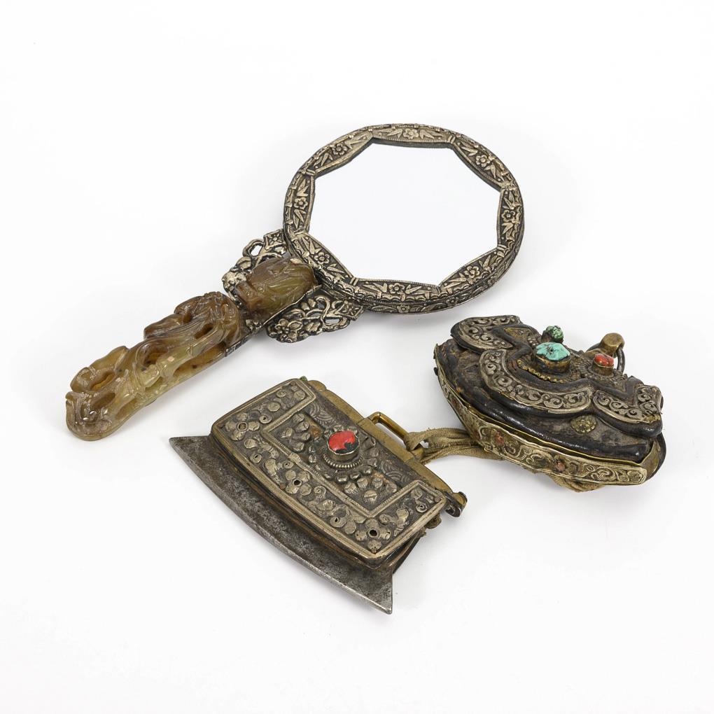 Mirror, fire steel and small bag. All with metal settings in relief, partly set with coral and turquoise. Mirror with a carved handle; back made of openwork soapstone. L 22 cm. Signs of age and wear.