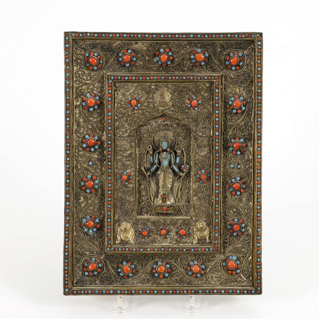 Heavily stylized, four-armed figure in slightly recessed center, flanked below by two animals. Dense ornamentation with stone set.