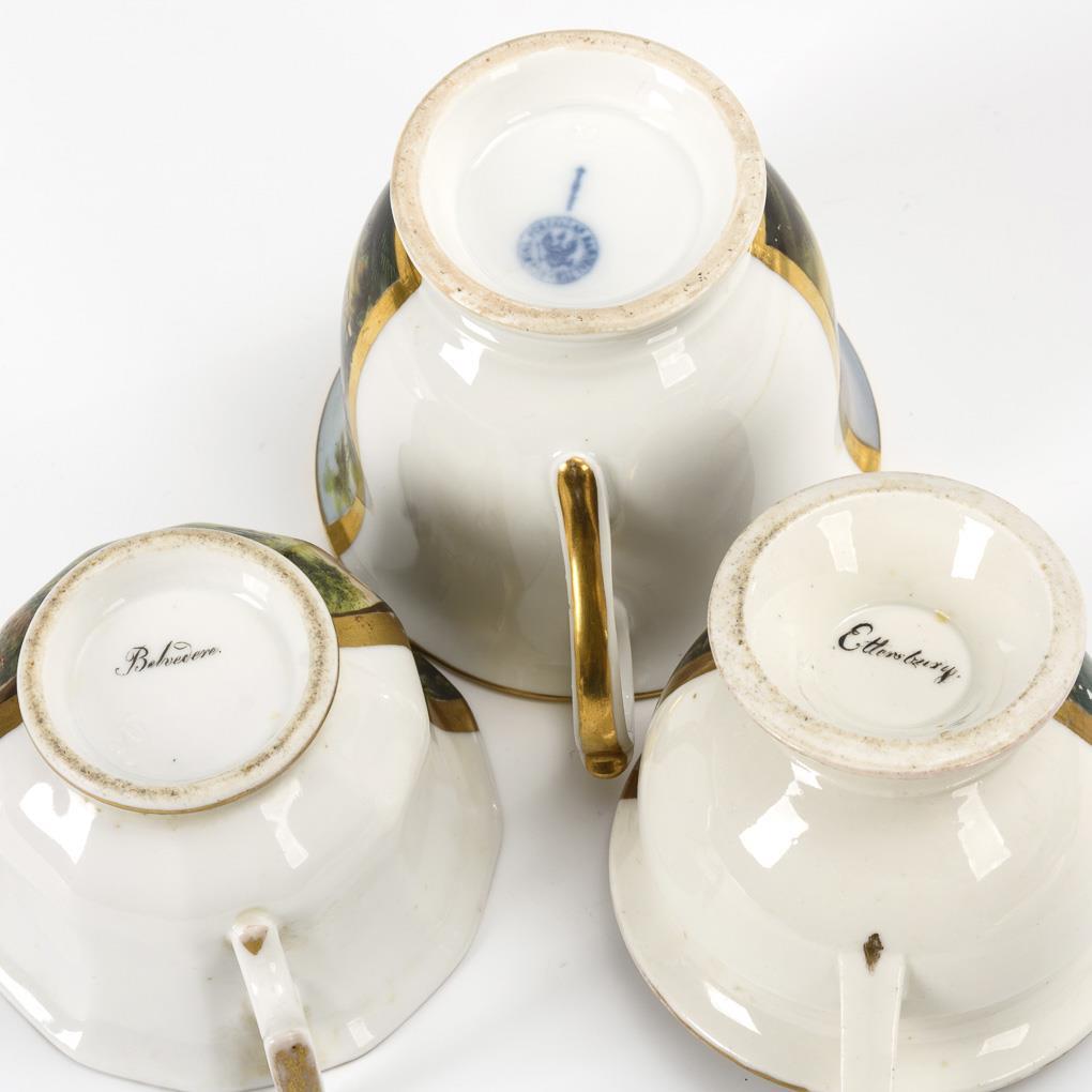 Footed bell cups with the inscribed views of Ettersburg Castle near Weimar, the town of Neustadt an der Orla and Belvedere Castle in Weimar. With original saucers, 1x of which with the inscription "Ihr verehrten Br. Ceremonienmeister die dankbaren Schwestern Jena, Weihnachten 1888" and 1x with the name "Emilie Pfeiffer.". Partial gold rubbing, 1x hairline crack in the saucer, 1x hairline crack in the cup.