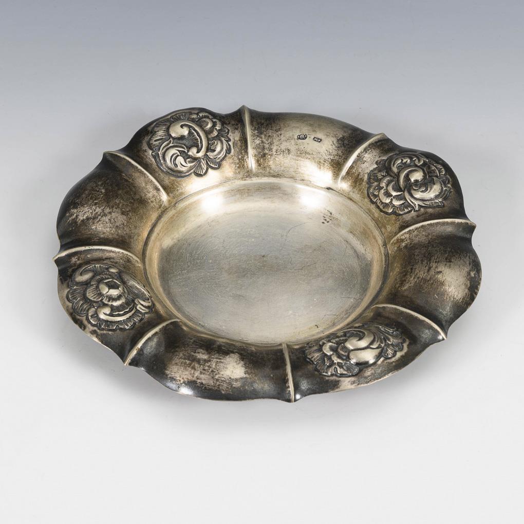 Round late Biedermeier bowl with flowers and rocailles in relief on the bossed rim. Slight signs of age and use.