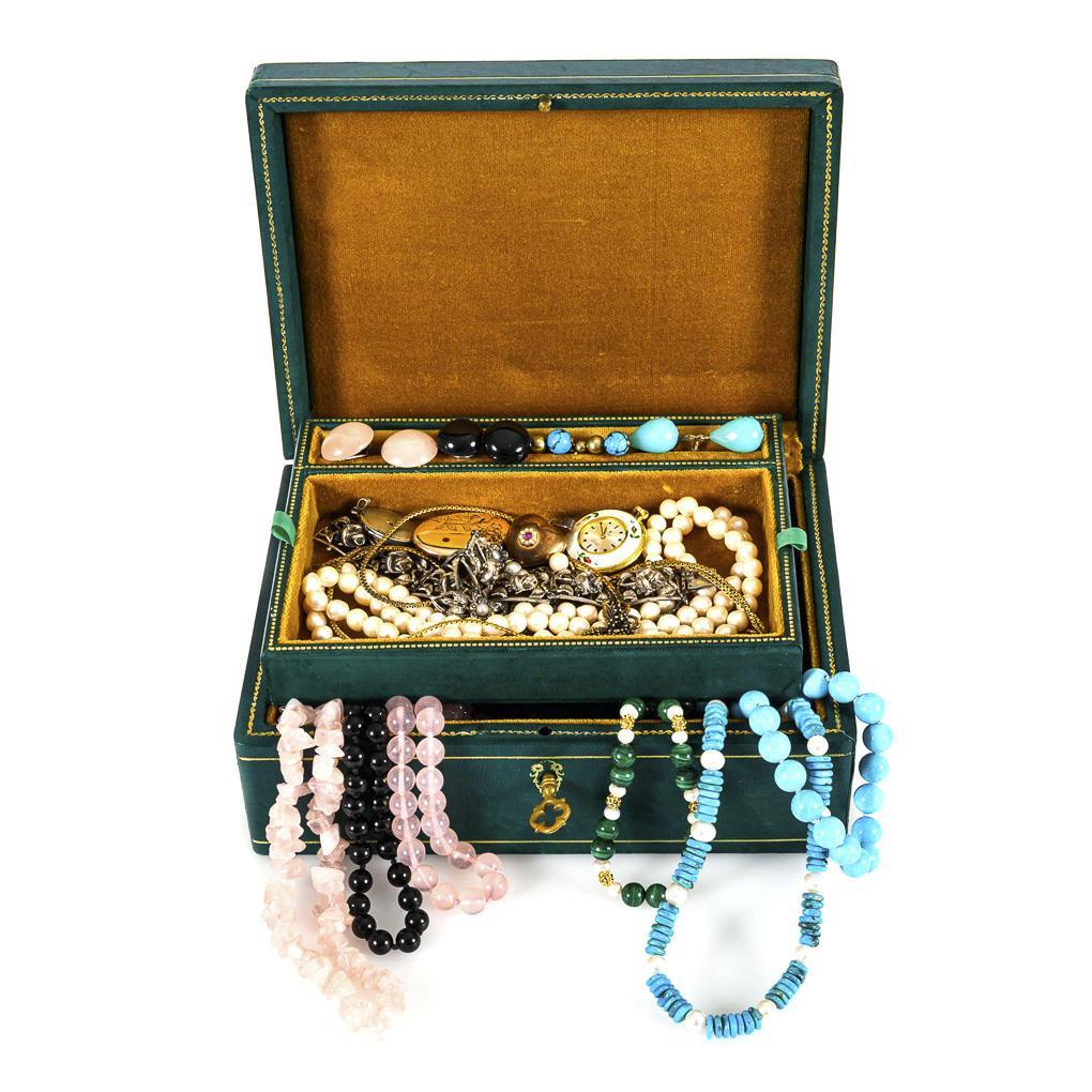9 different necklaces (rose quartz, onyx, turquoise, malachite, cultured pearl), necklace and bracelet, 3 pairs of earrings, 2 pairs of earclips, enameled pendant watch "STOWA"