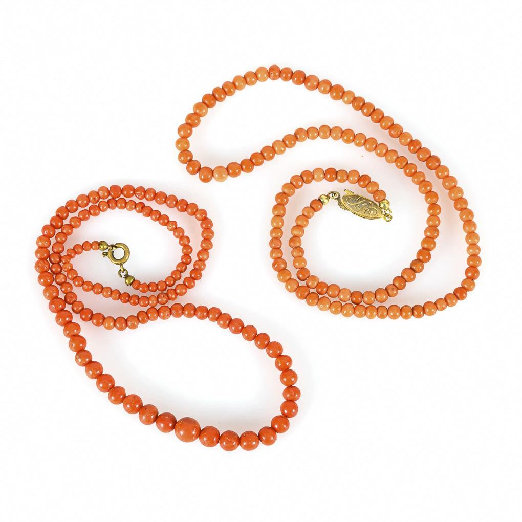 Lacing necklace with small coral balls on decorative clasp. Laced necklace with coral beads in slight gradient on metal ring spring clasp.