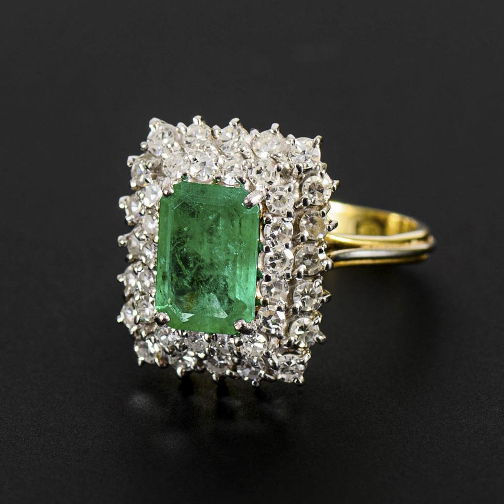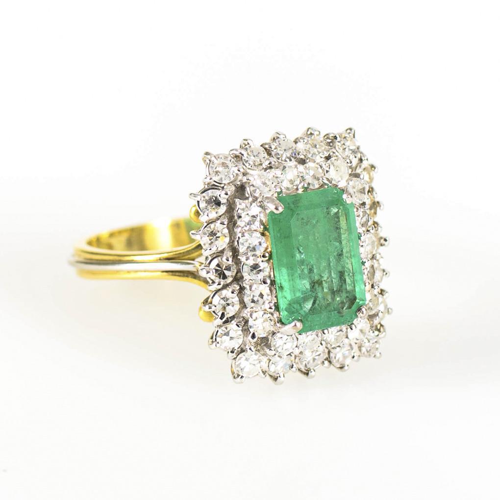 Yellow gold/white gold 750 stamped. Emerald approx. 2,5 ct. Diamonds total approx. 2.2 ct. Ring size 58. 7.8 g.