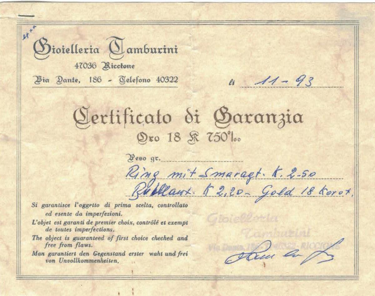 Claw-set emerald surrounded by 38 diamonds, between 2-color rail.
