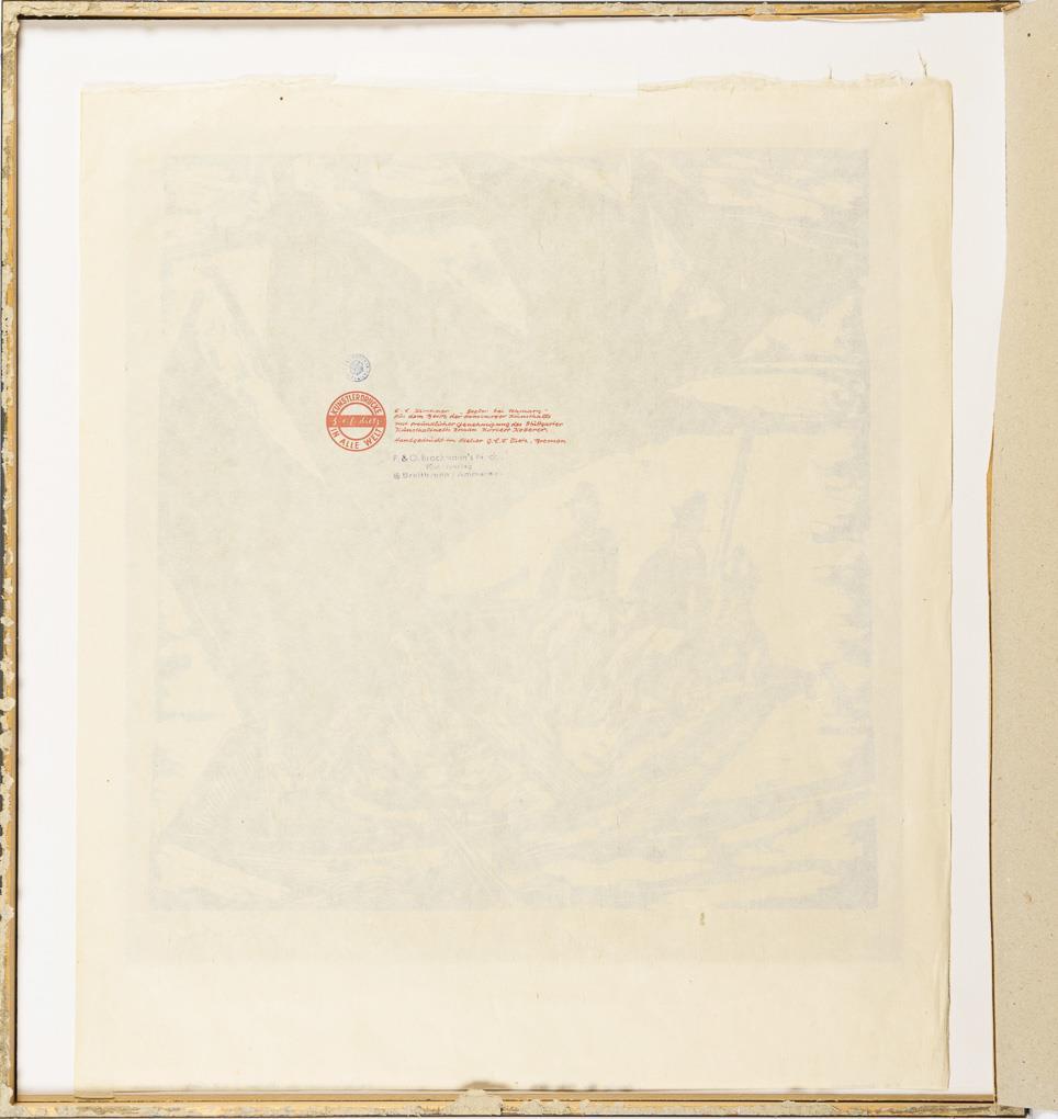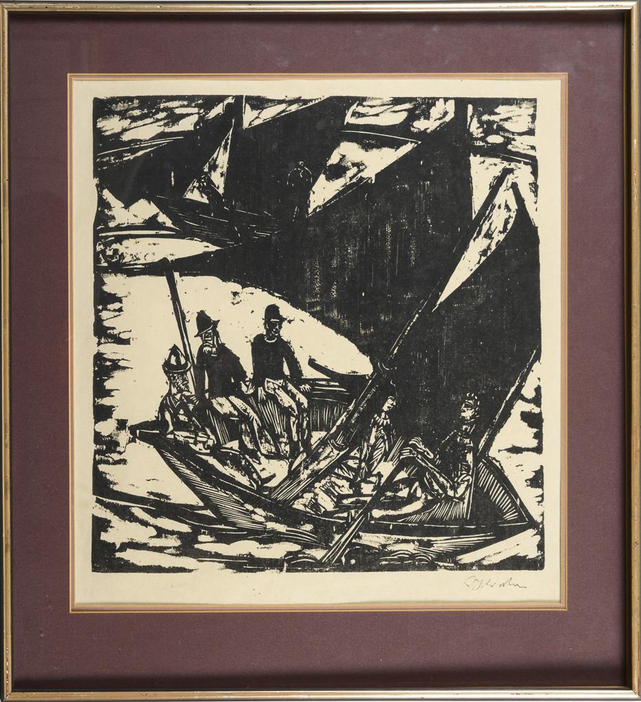 Woodcut on Japanese paper. Stamp signature, lower margin handwritten inscribed. Verso red stamp "G. l. F. Dietz Künstlerdrucke in alle Welt [...]", blue stamp "Zollamt München-Pasing", purple stamp "F. & O. Brockmann Nachf. Kunstverlag".