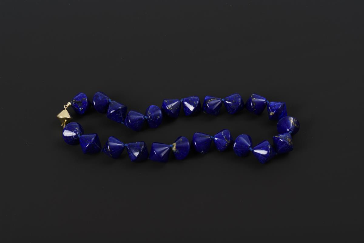 Lacing chain with 23 lapis double cones in single knot on matching clasp. In 2 cases.