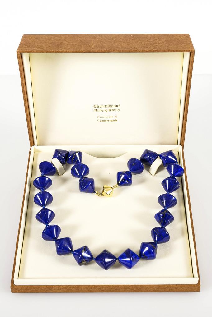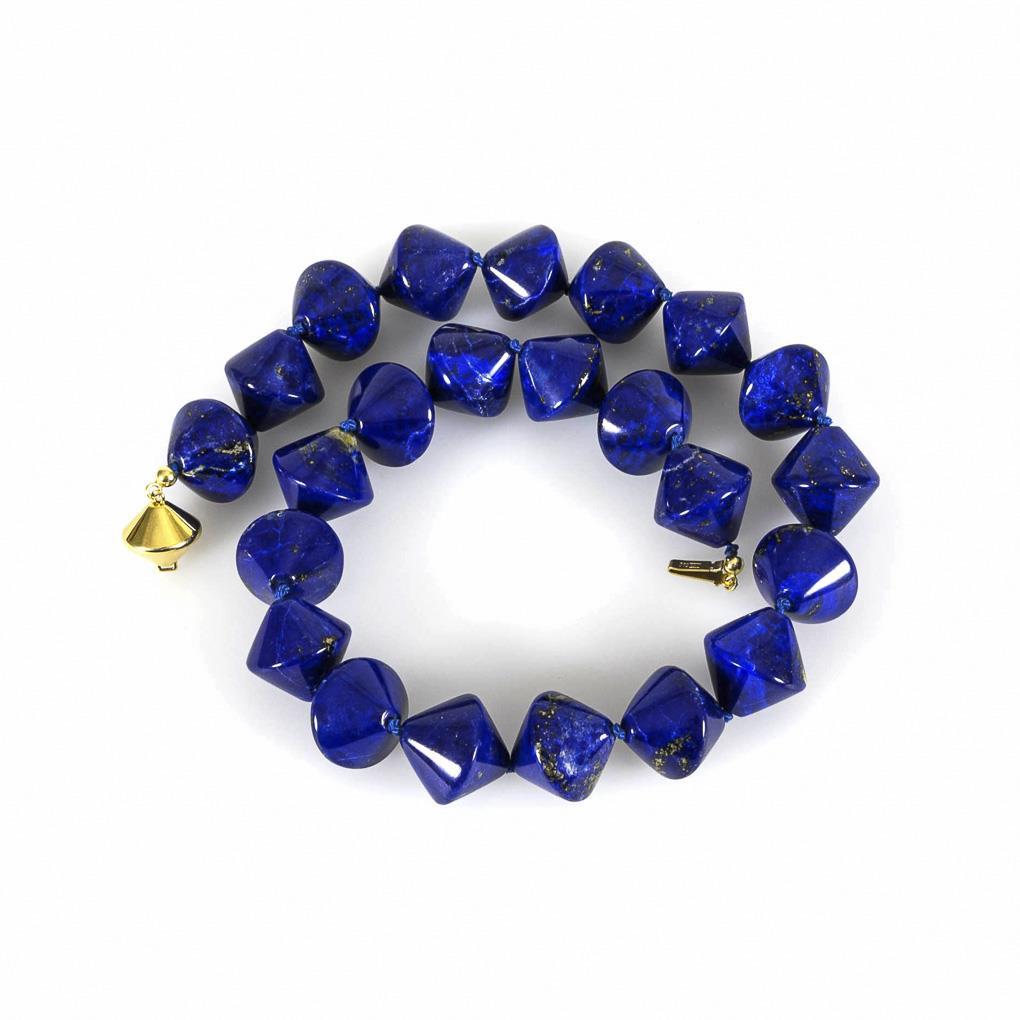 Yellow gold clasp 585 stamped. L 55 cm. Lapis 2 x 2 cm. 202 g.