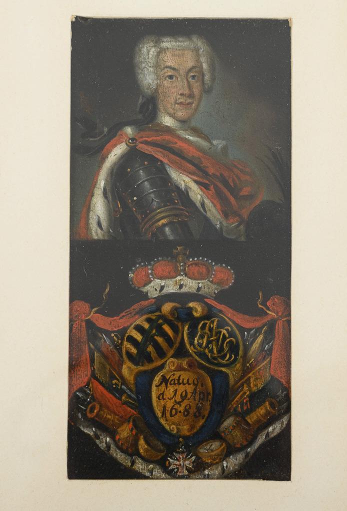 High rectangular miniature divided centrally: Above bust portrait of the Duke in armor with sable coat; below ducal hat, Saxon coat of arms and monogram "EADS", cartouche with date of birth "Natuo d. 19 April 1688" above trophies. Minimal signs of age / use.
