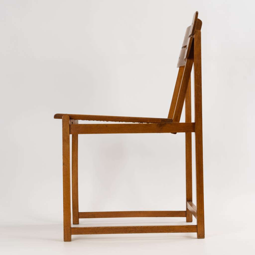 Streng funktioneller Stuhl mit Schultergurt und abgeschrägter Sitzfläche, in Anlehnung an Modelle Marcel Breuers (1902 Pecs - 1981 New York City). Alters-/Gebrauchsspuren.