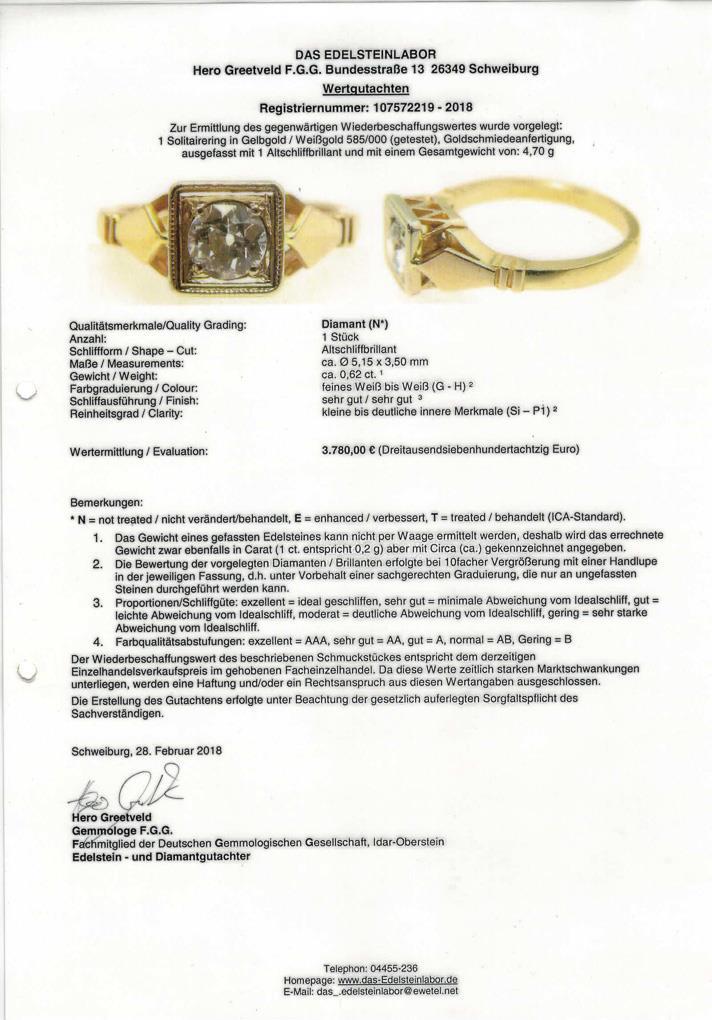Tested yellow gold 585. Goldsmith's work. Brilliant diamond approx. 0.62 ct/G-H/si-PI. Ring size 57. 4.7 g.
