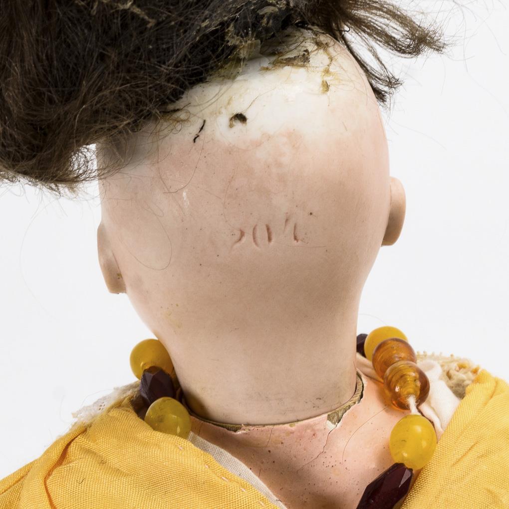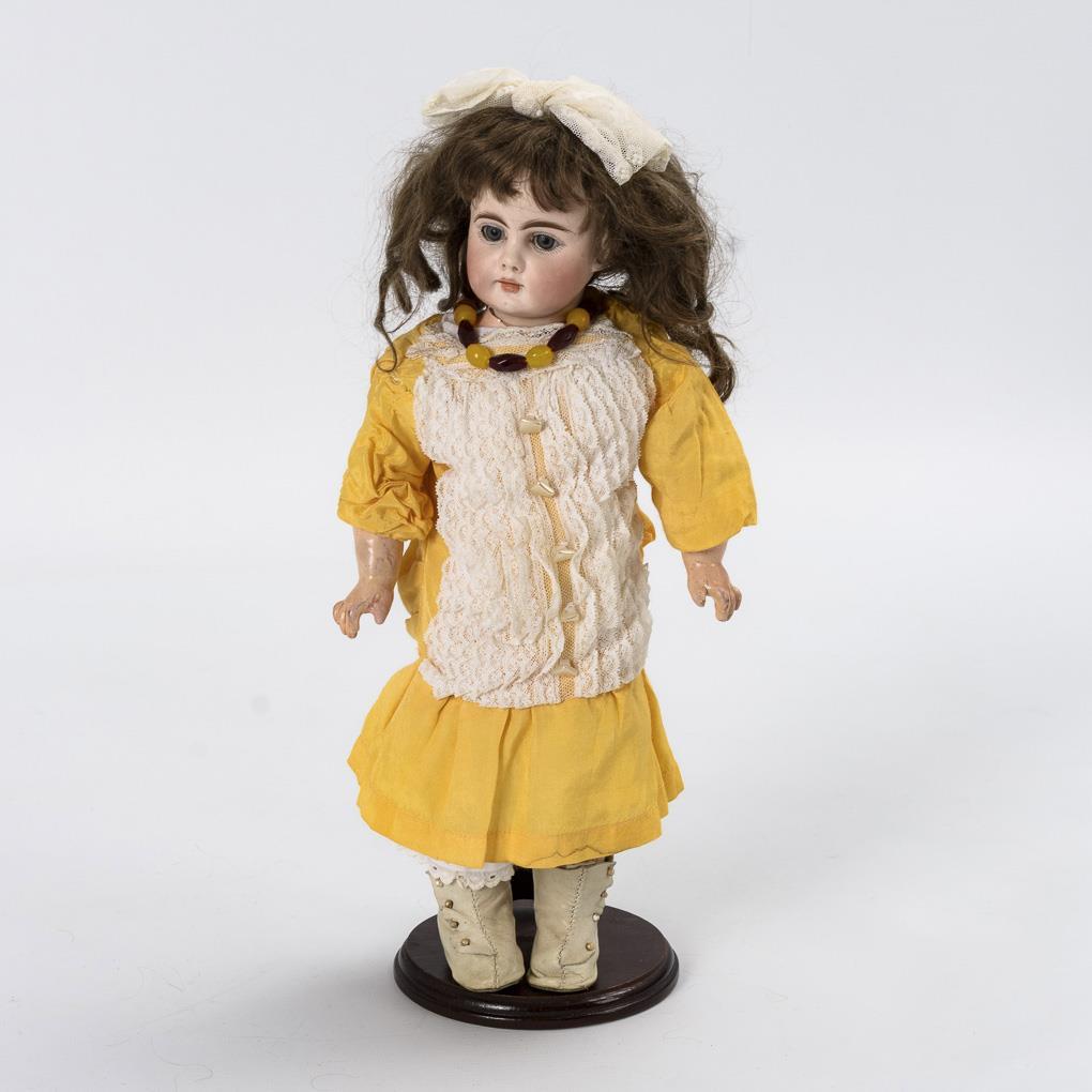 Crank head (full head), fixed blue glass eyes, brown mohair wig, ear holes. 9-piece articulated body. Yellow dress, white leather boots, white hair bow. Small bump on the right ear, hands and feet with repair spots.