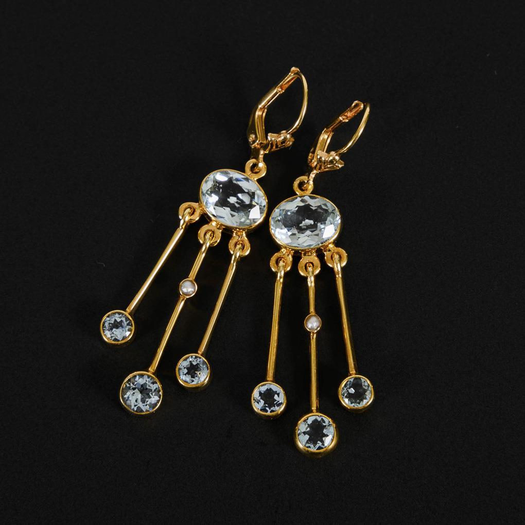Suspensions with 8 casket-set aquamarines and 2 pearls, on spring bails.