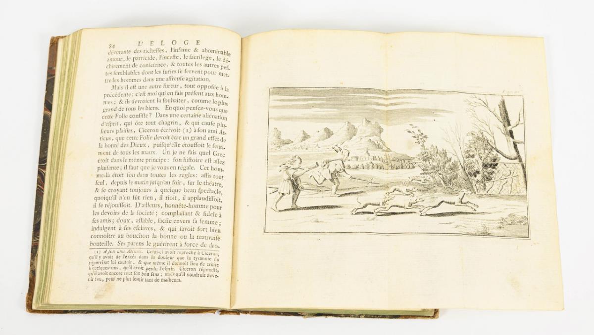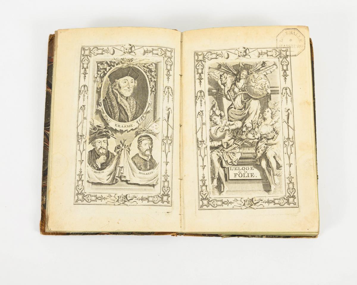 "Composé en forme de Déclamation par Erasme. Et traduit par Mr. Gueudeville, Avec les Notes de Gerard Listre, ... Le tout sur l'original de l' Université de Basle. Nouvelle Edition ...". Portraits of Erasme, Morus and Holbein on one page, title copperplate, title, (14), 234, (14) pages with 75 page illustrations and 6 plates. French language, half leather binding. Old signs of use, spine and edges more rubbed.