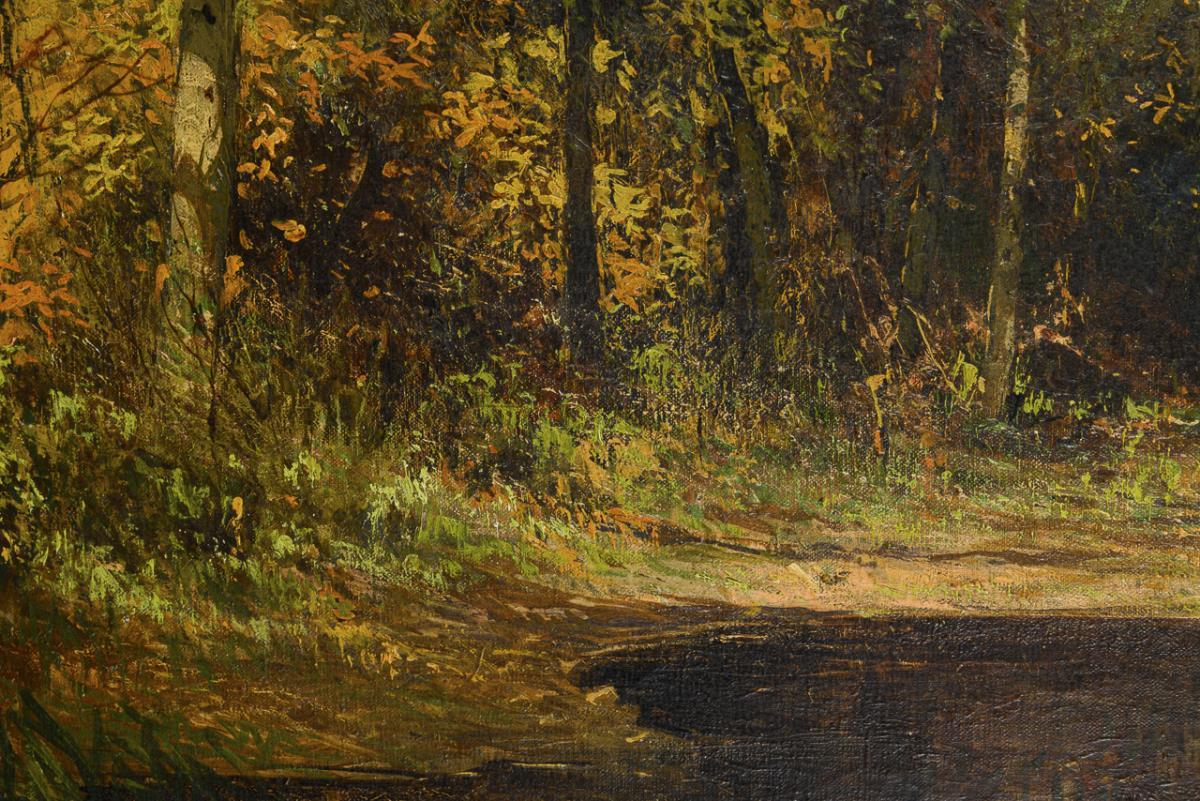 Bright sunshine over the autumnally colored trees in the clearing with the pond.