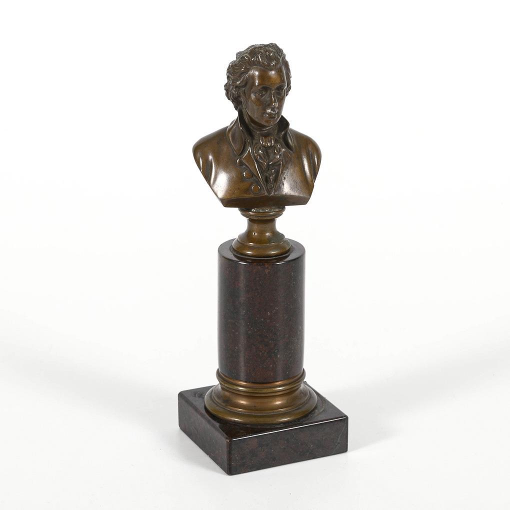 Bronze brown patinated, black and red marble base with column base of bronze. Founder's mark "Akt: Gesellsch: vorm: H. Gladenbeck & Sohn". H 8,5 / 17 cm.