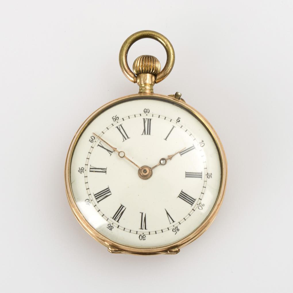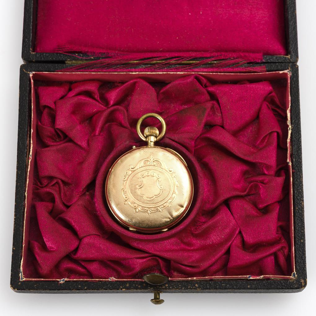 Unmarket movement with cylinder escapement, tire balance, jewels, crown winding, running. White enamel dial with Roman and Arabic numerals, minute ring and lancet hands.