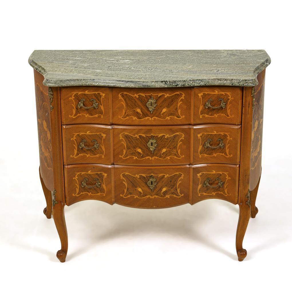 3-bowl, style-typical curved chest of drawers with marble top, decorated with lush bronze applications and rocaille-framed floral marquetry on the front and sides. Slight signs of age/use.