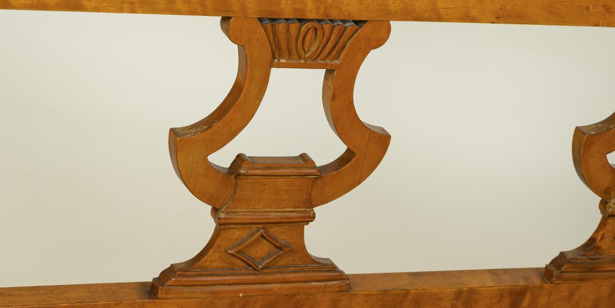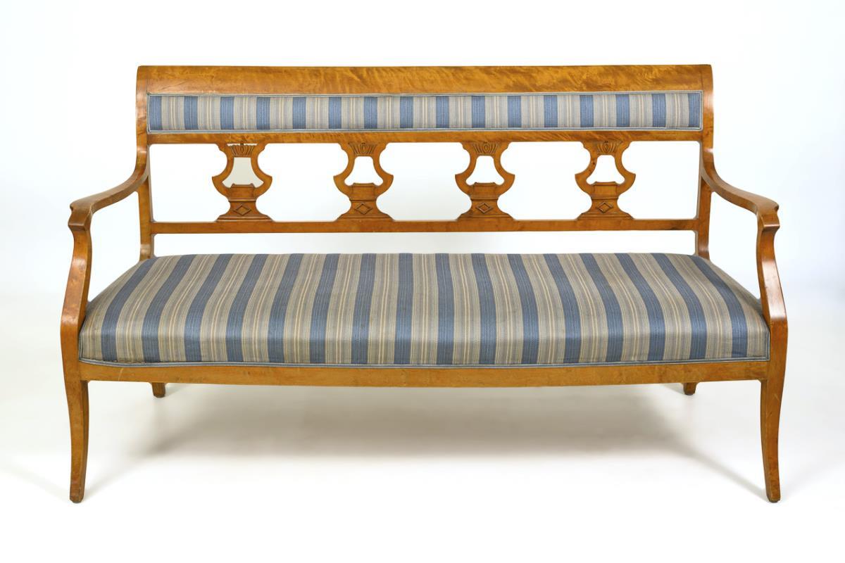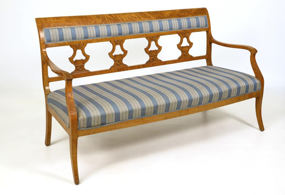 Sofabank for 3 persons with upholstered seat, slightly flared armrests and openwork backrest with struts in the shape of a lyre and partially upholstered shoulder board; blue-striped cover. Signs of age/use.