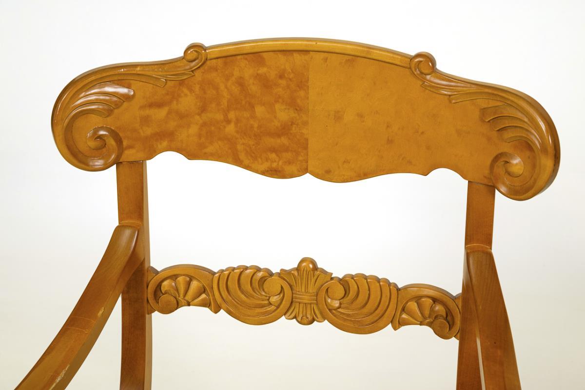 2 armchairs with upholstered seat and scoop-shaped backrest with carving decoration; green-striped cover. Slight signs of age/use.