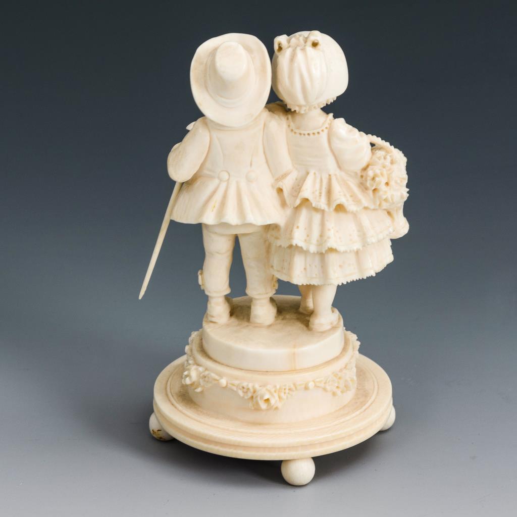 Gestufter Elfenbein-Sockel mit Rosengirlanden. Darauf stehendes Kinderpaar in Biedermeierkostümierung. .